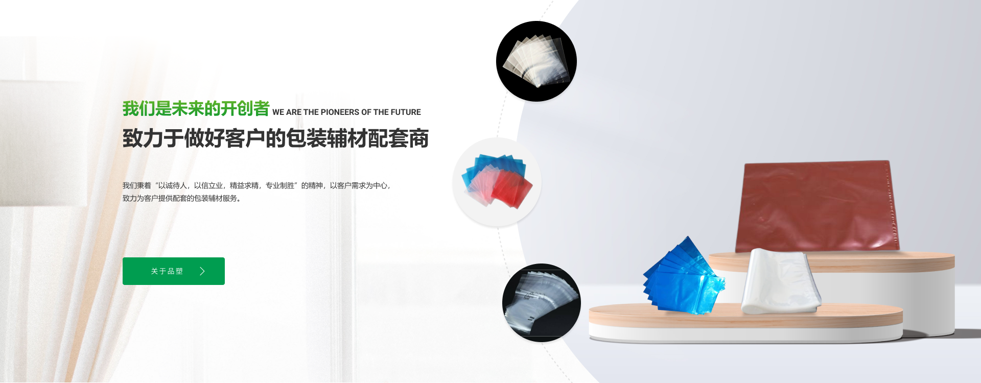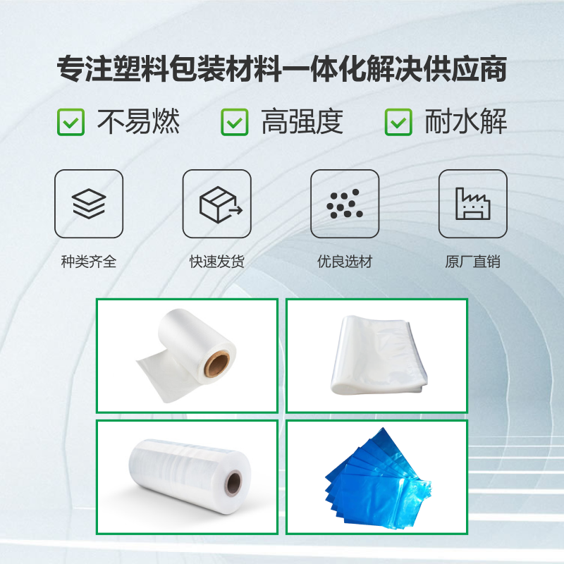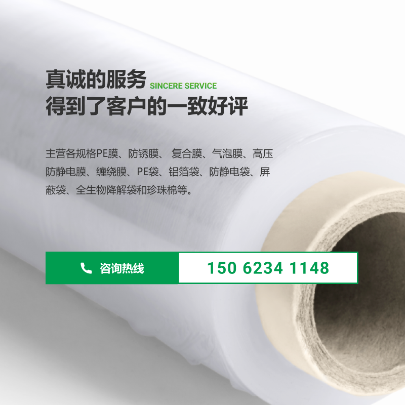 公司主營生產、銷售:各種類PE膜、高壓防銹膜、高壓防靜電膜、纏繞膜、氣泡膜;各類PE平口袋、PE方底袋(四方袋)、鋁塑方底袋、VCI防銹袋、防靜電袋、折邊袋、屏蔽袋、氣泡袋、印刷袋以及全生物降解袋等。